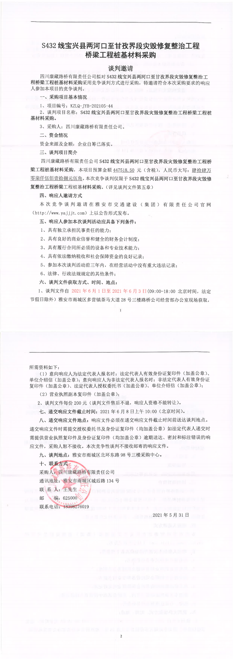 四川康藏路橋有限責任公司S432線寶興縣兩河口至甘孜界段災(zāi)毀修復整治工程橋梁樁基材料采購競爭談判公告