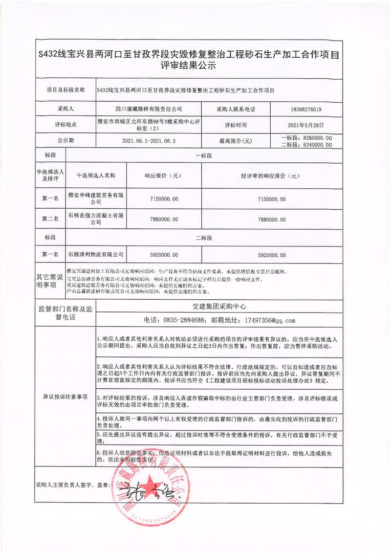 四川康藏路橋有限責(zé)任公司S432線寶興縣兩河口至甘孜界段災(zāi)毀修復(fù)整治工程砂石生產(chǎn)加工合作項目評審結(jié)果公示
