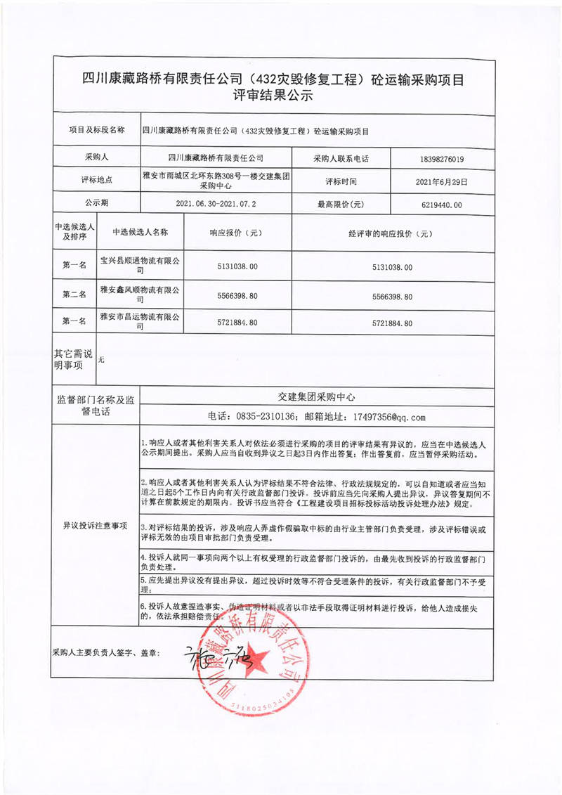 四川康藏路橋有限責(zé)任公司S432線寶興縣兩河口至甘孜界段災(zāi)毀修復(fù)整治工程砼運(yùn)輸采購項(xiàng)目評審結(jié)果公示