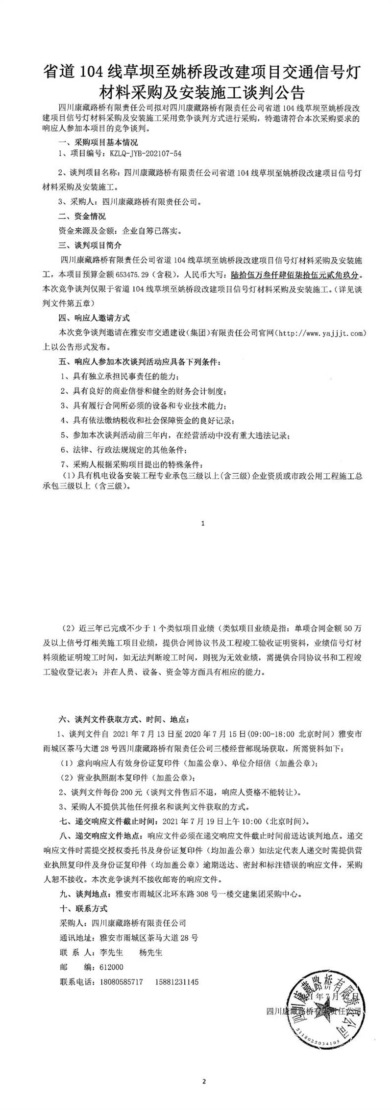 四川康藏路橋有限責(zé)任公司省道104線草壩至姚橋段改建項(xiàng)目交通信號(hào)燈材料采購(gòu)及安裝施工競(jìng)爭(zhēng)談判公告