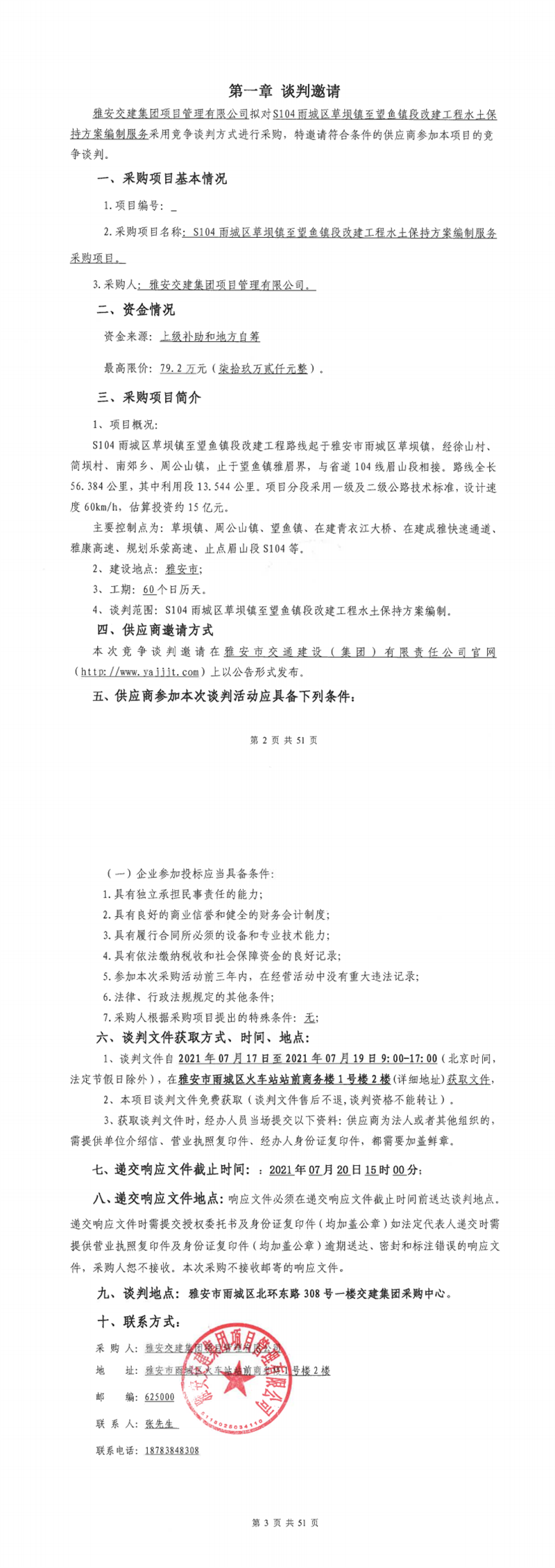 雅安交建集團項目管理有限公司S104雨城區(qū)草壩鎮(zhèn)至望魚段改建工程水土保持方案編制服務采購項目競爭談判公告