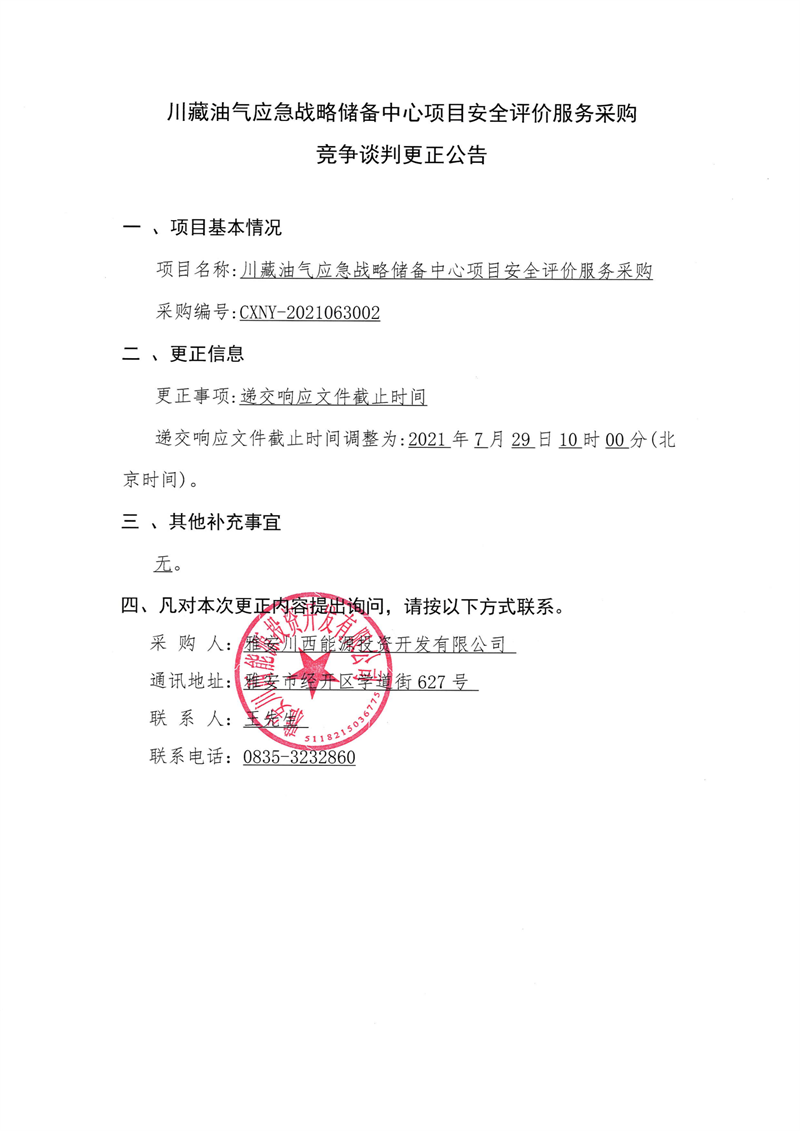雅安川西能源投資開發(fā)有限公司川藏油氣應(yīng)急戰(zhàn)略儲備中心項(xiàng)目安全評價(jià)服務(wù)采購競爭談判更正公告