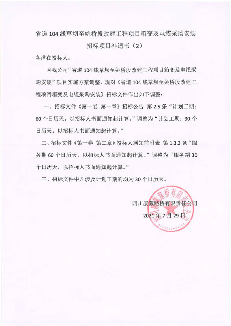 四川康藏路橋有限責任公司省道104線草壩至姚橋段改建項目箱變及電纜采購安裝招標項目補遺書(2)