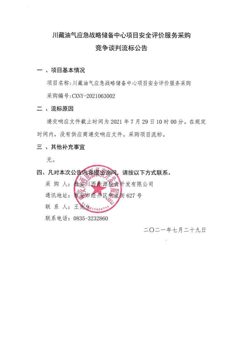 雅安川西能源投資開發(fā)有限公司川藏油氣應(yīng)急戰(zhàn)略儲備中心項目安全評價服務(wù)采購競爭談判流標公告