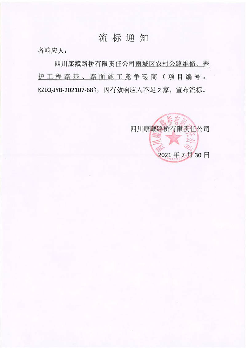 四川康藏路橋有限責(zé)任公司雨城區(qū)農(nóng)村公路維修、養(yǎng)護工程路基、路面施工競爭磋商流標通知