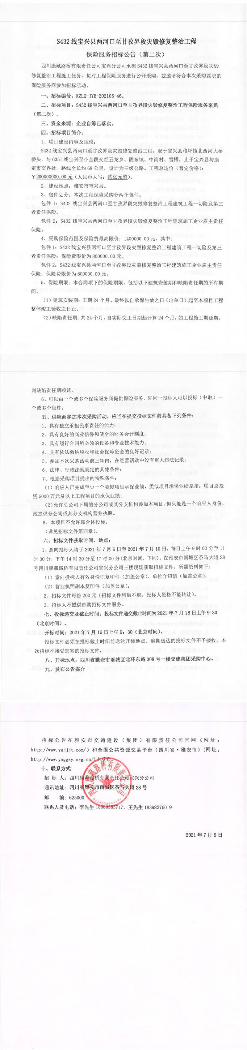 四川康藏路橋有限責任公司S432線寶興縣兩河口至甘孜界段災毀修復整治工程保險服務招標公告(第二次)