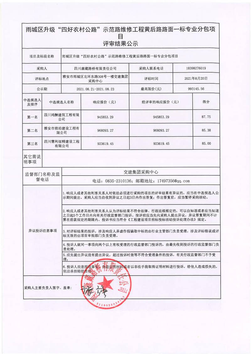 四川康藏路橋有限責(zé)任公司雨城區(qū)升級“四好農(nóng)村公路”示范路維修工程黃后路路面一標(biāo)專業(yè)分包項(xiàng)目評審結(jié)果公示