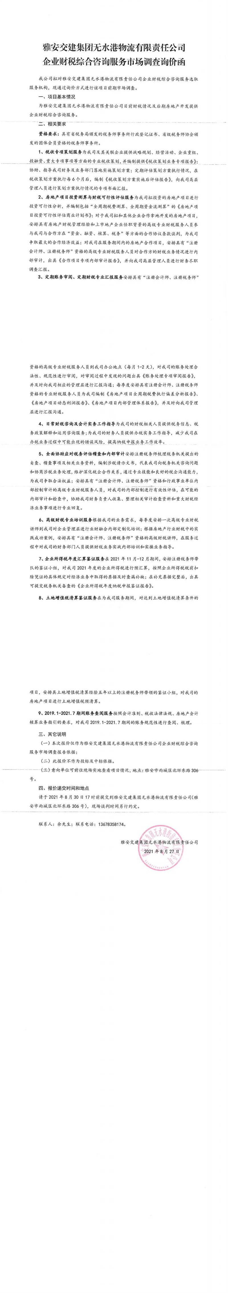 雅安交建集團無水港物流有限責(zé)任公司企業(yè)財稅綜合咨詢服務(wù)市場調(diào)查詢價函
