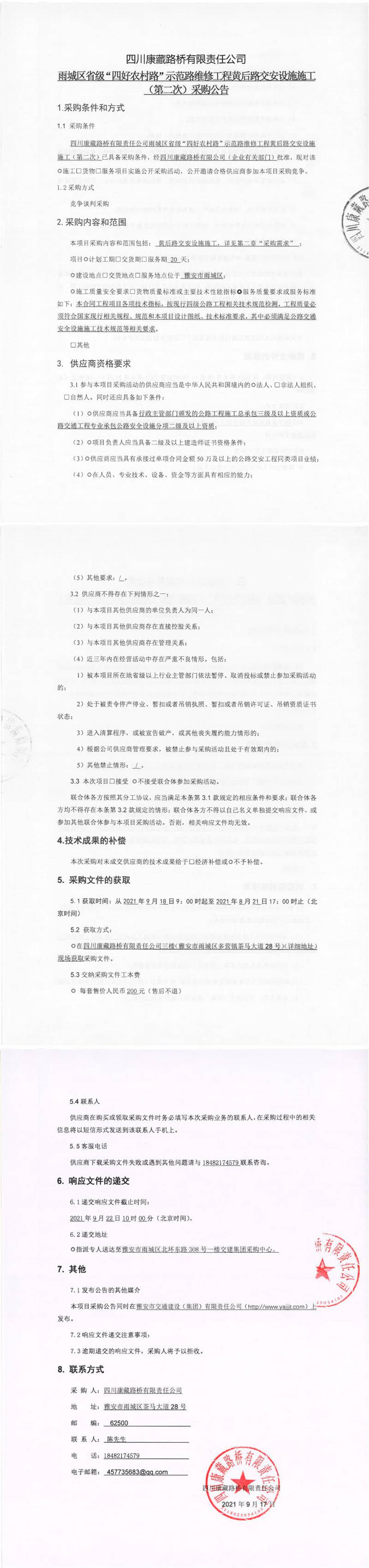 四川康藏路橋有限責(zé)任公司雨城區(qū)省級“四好農(nóng)村路”示范路維修工程黃后路交安設(shè)施施工(第二次)采購公告