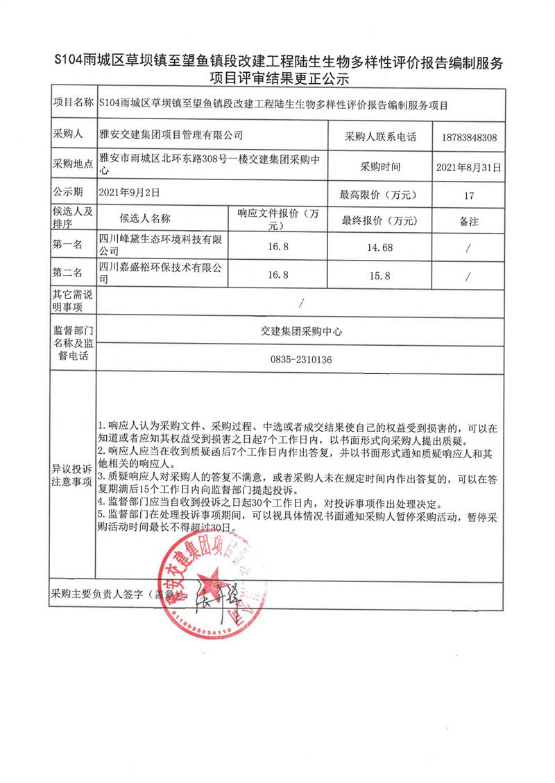 雅安交建集團(tuán)項(xiàng)目管理有限公司S104雨城區(qū)草壩鎮(zhèn)至望魚鎮(zhèn)段改建工程陸生生物多樣性評價報(bào)告編制服務(wù)項(xiàng)目評審結(jié)果更正公示