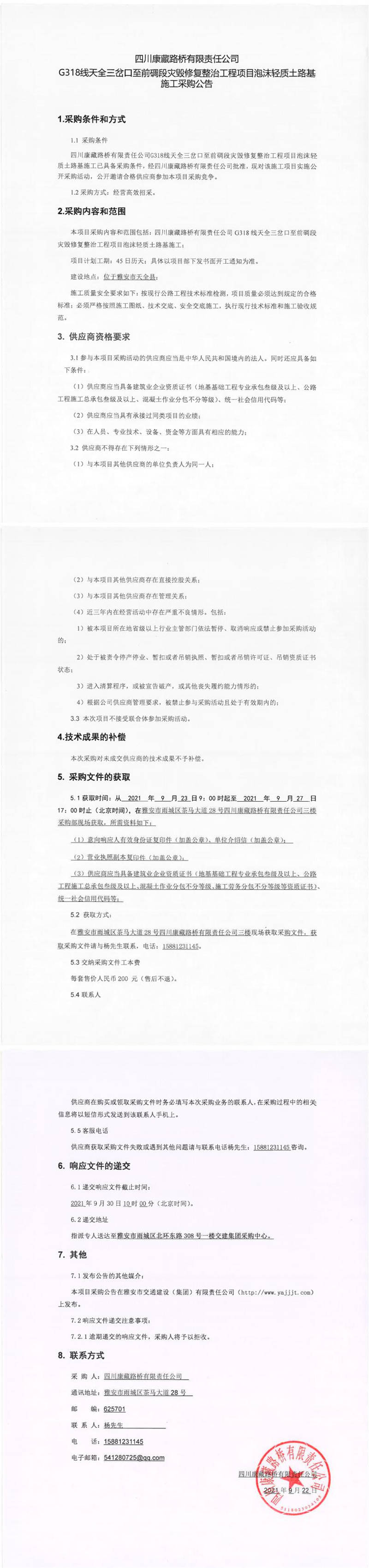 四川康藏路橋有限責任公司G318線天全三岔口至前碉段災(zāi)毀修復整治工程項目泡沫輕質(zhì)土路基施工采購公告