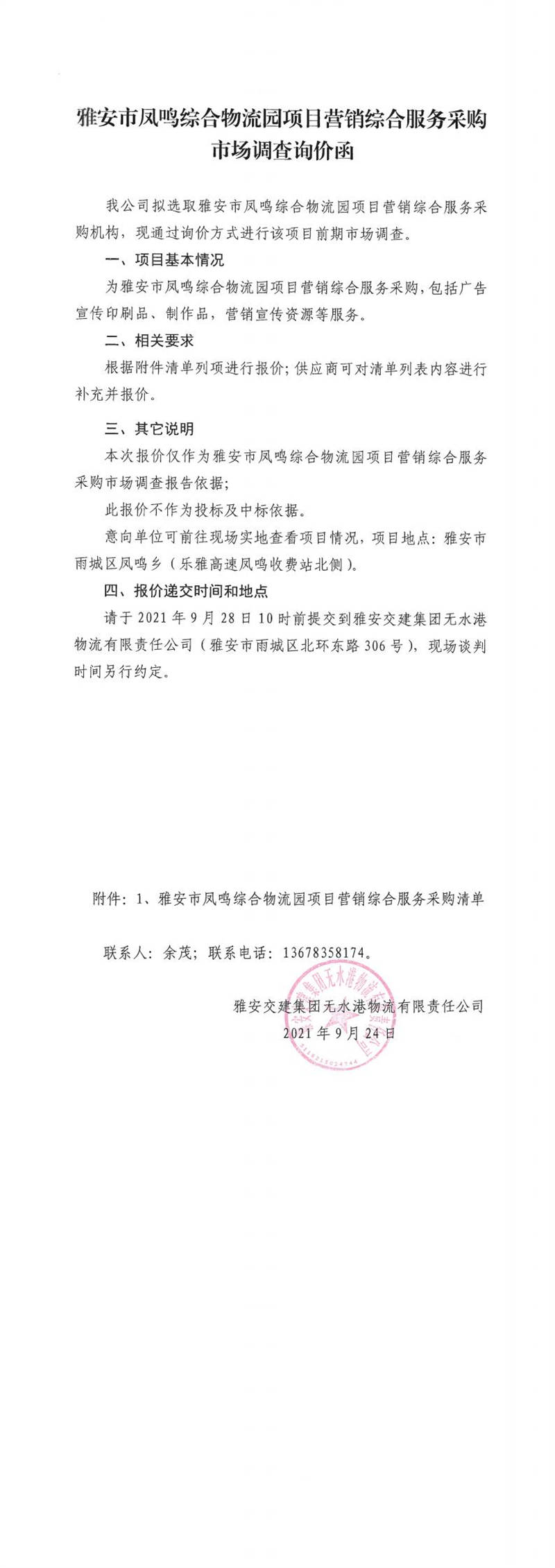 雅安交建集團(tuán)無水港物流有限責(zé)任公司雅安市鳳鳴綜合物流園項(xiàng)目營(yíng)銷綜合服務(wù)采購(gòu)市場(chǎng)調(diào)查詢價(jià)函
