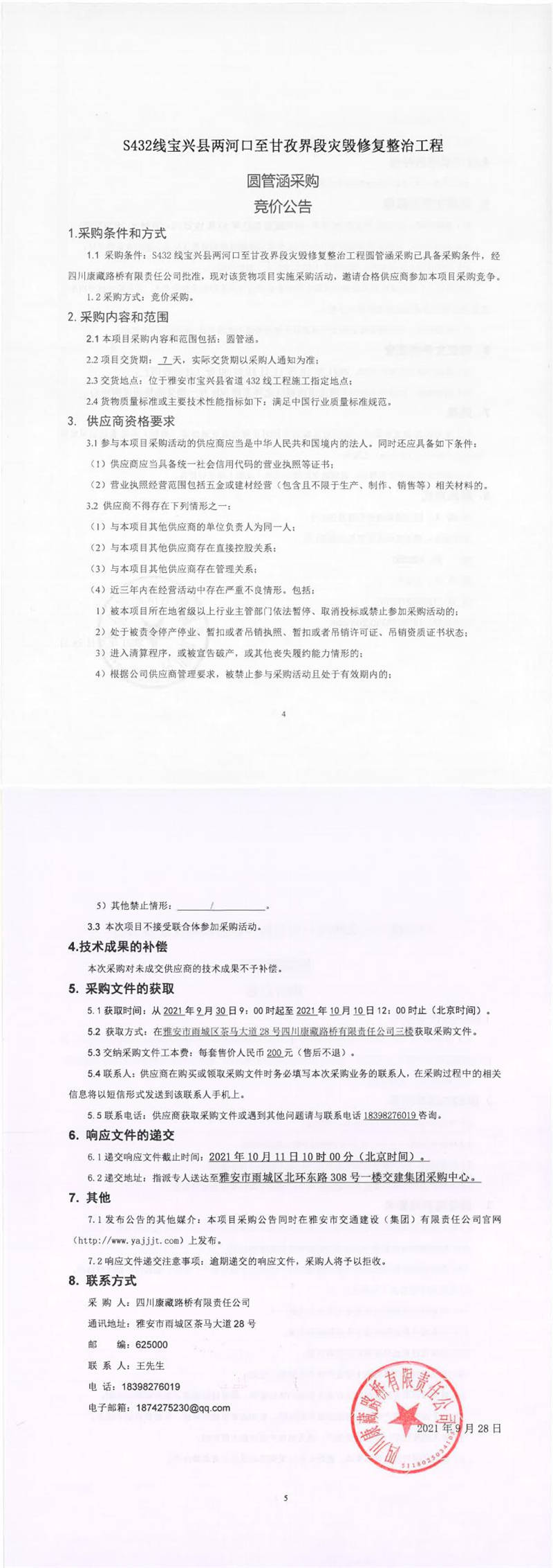 四川康藏路橋有限責(zé)任公司S432線寶興縣兩河口至甘孜界段災(zāi)毀修復(fù)整治工程圓管涵采購競價(jià)公告