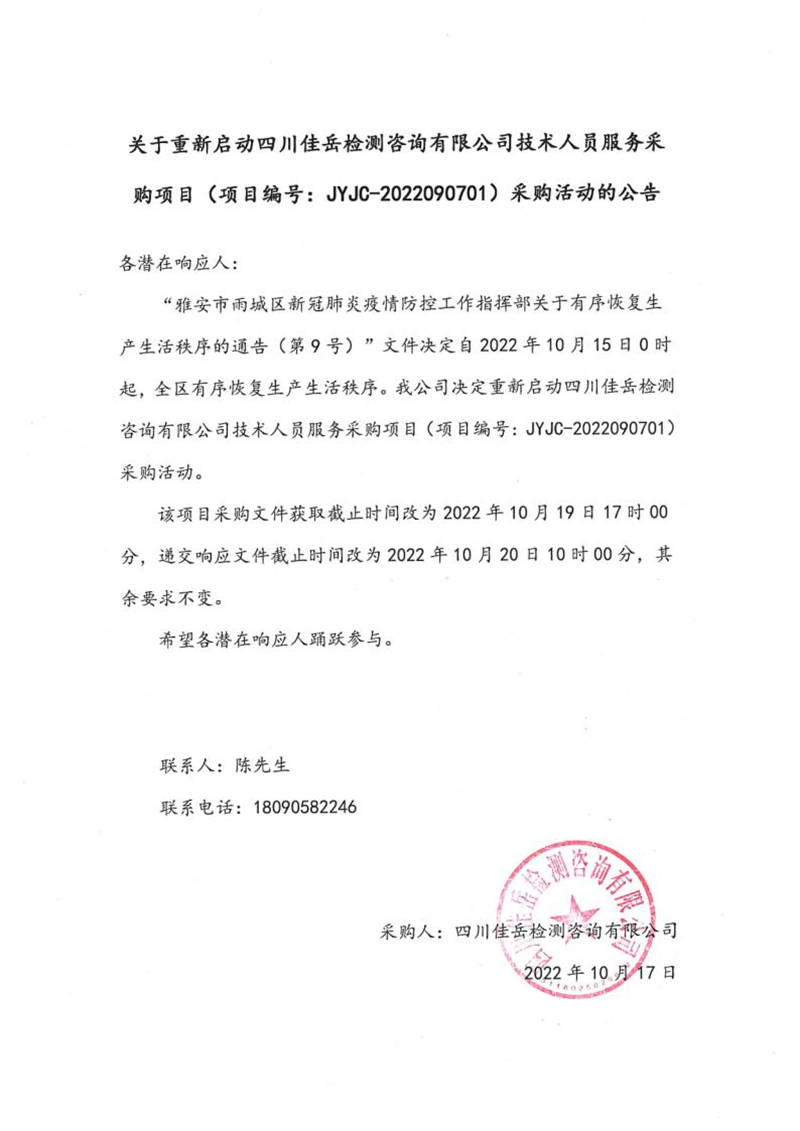四川佳岳檢測咨詢有限公司關于重新啟動四川佳岳檢測咨詢有限公司技術人員服務采購項目(項目編號:JYJC-2022090701)采購活動的公告