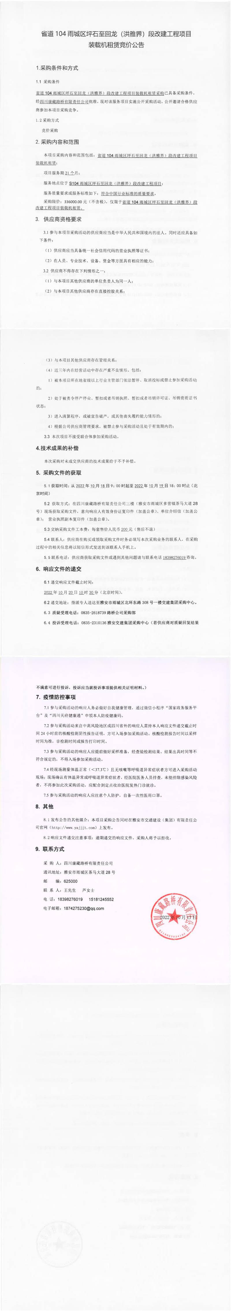 四川康藏路橋有限責(zé)任公司省道104雨城區(qū)坪石至回龍(洪雅界)段改建工程項目裝載機租賃競價公告