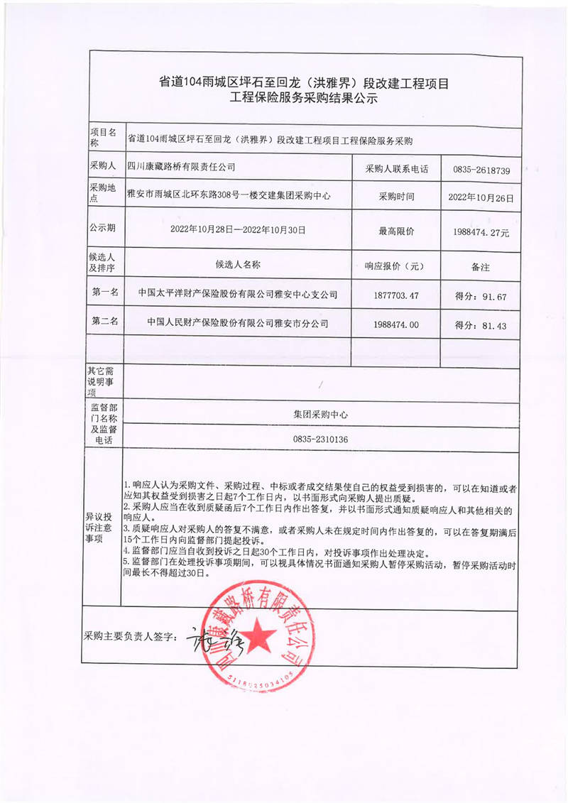 四川康藏路橋有限責任公司省道104雨城區(qū)坪石至回龍(洪雅界)段改建工程項目工程保險服務采購結果公示