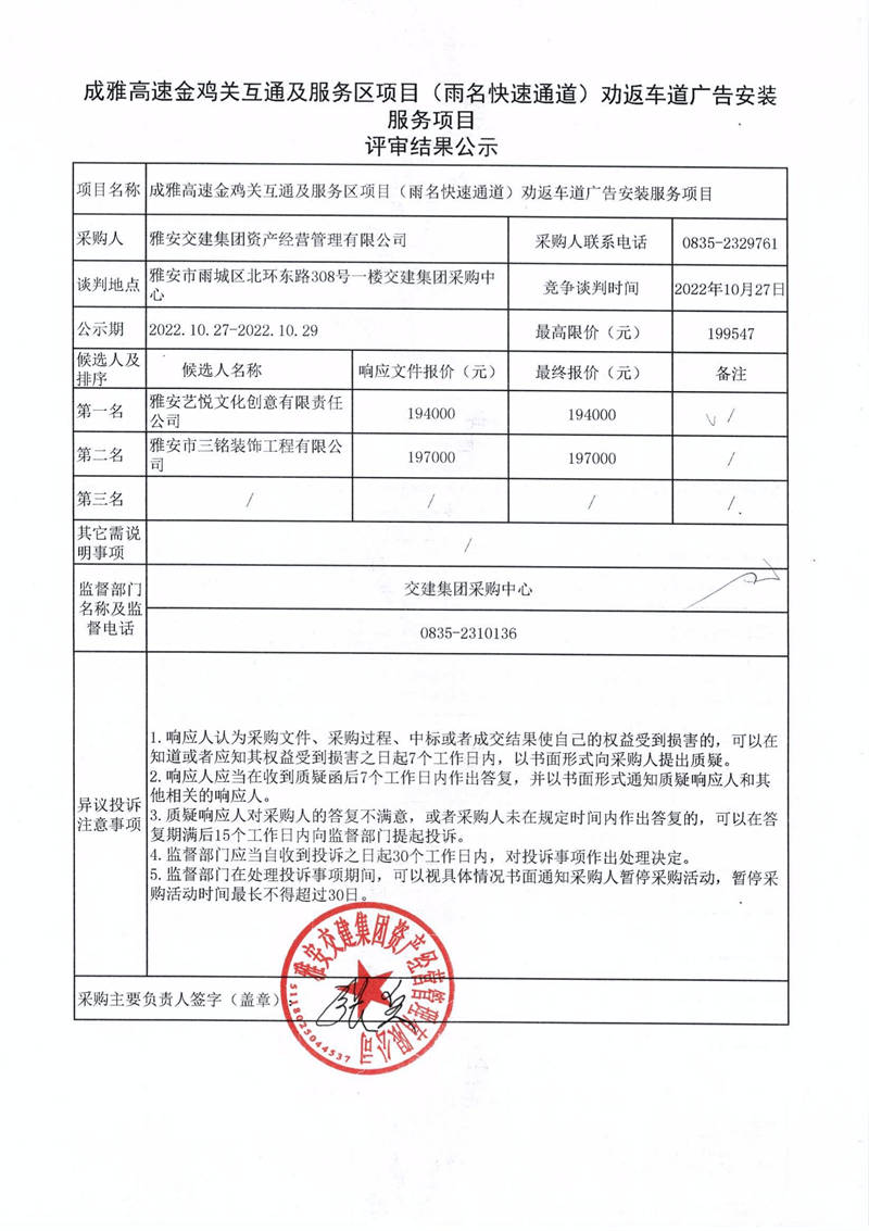雅安交建集團資產(chǎn)經(jīng)營管理有限公司成雅高速金雞關(guān)互通及服務(wù)區(qū)項目(雨名快速通道)勸返車道廣告安裝服務(wù)項目評審結(jié)果公示