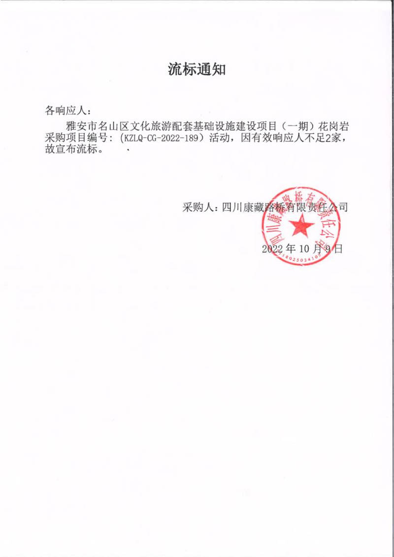 四川康藏路橋有限責任公司雅安市名山區(qū)文化旅游配套基礎(chǔ)設(shè)施建設(shè)項目(一期)花崗巖采購項目流標通知