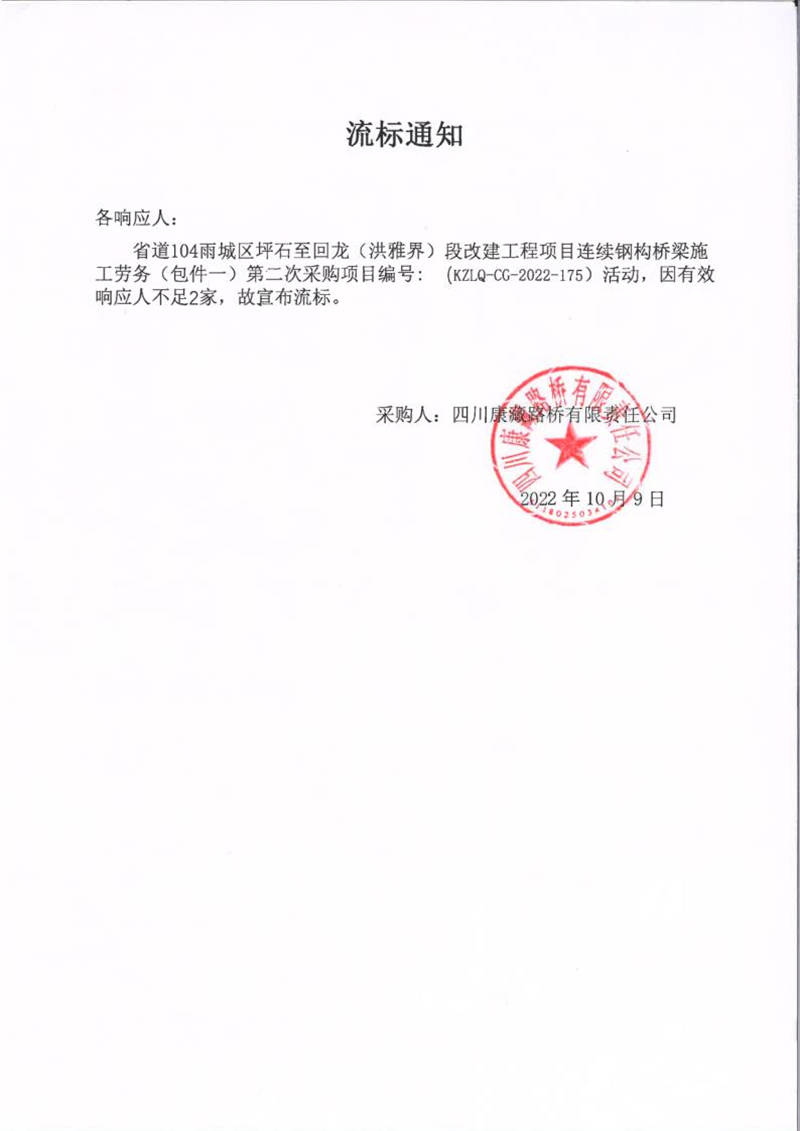 四川康藏路橋有限責(zé)任公司省道104雨城區(qū)坪石至回龍(洪雅界)段改建工程項目連續(xù)鋼構(gòu)橋梁施工勞務(wù)(包件一)第二次采購項目流標(biāo)通知