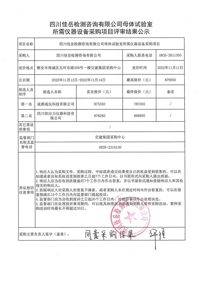 四川佳岳檢測(cè)咨詢有限公司母體試驗(yàn)室所需儀器設(shè)備采購項(xiàng)目評(píng)審結(jié)果公示