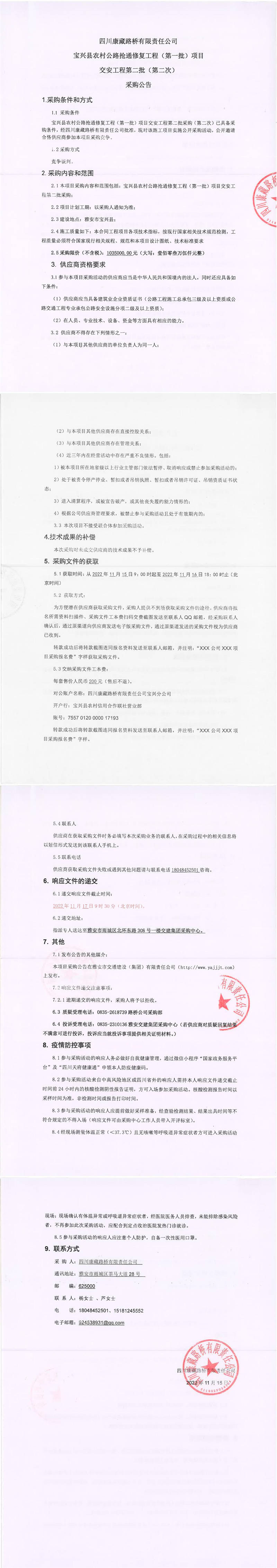 四川康藏路橋有限責(zé)任公司寶興縣農(nóng)村公路搶通修復(fù)工程(第一批)項目交安工程第二批(第二次)采購公告