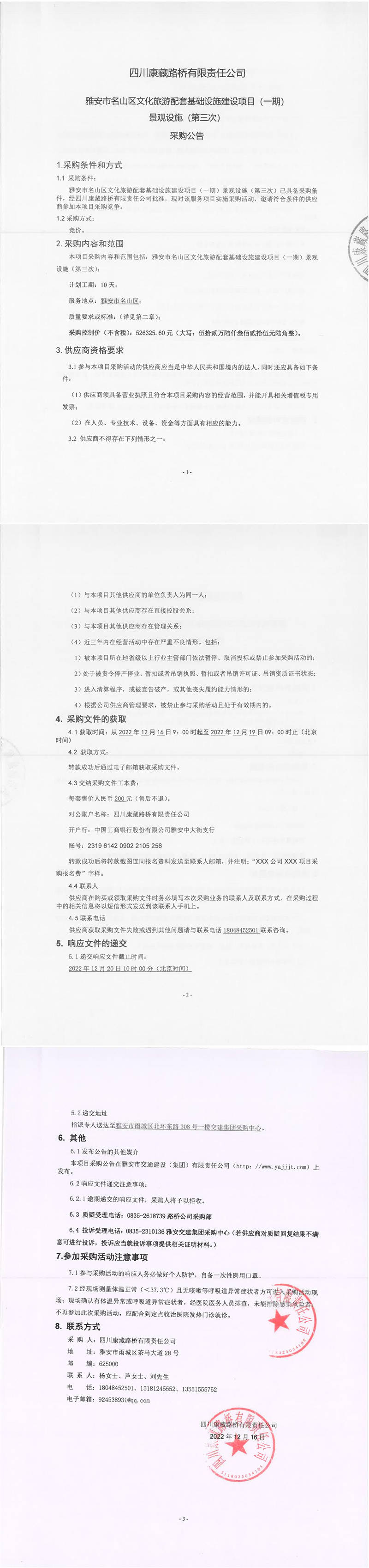 四川康藏路橋有限責(zé)任公司雅安市名山區(qū)文化旅游配套基礎(chǔ)設(shè)施建設(shè)項(xiàng)目(一期)景觀(guān)設(shè)施(第三次)采購(gòu)公告