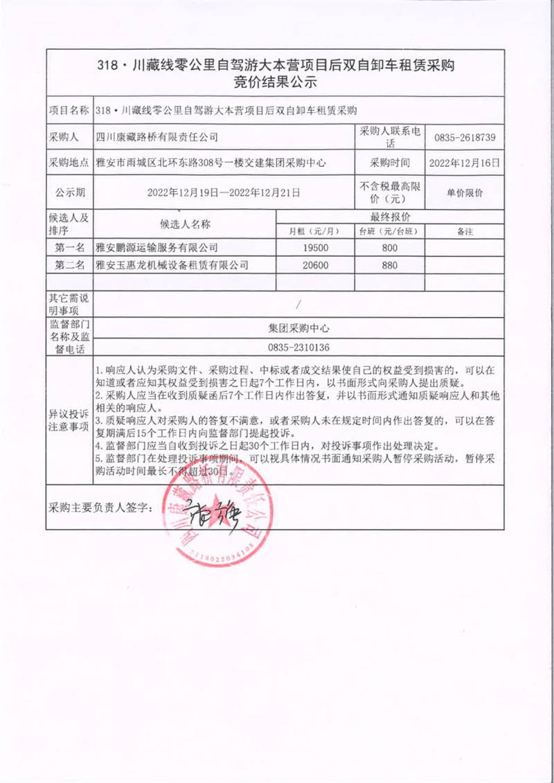 四川康藏路橋有限責(zé)任公司318·川藏線零公里自駕游大本營(yíng)項(xiàng)目后雙自卸車(chē)租賃采購(gòu)競(jìng)價(jià)結(jié)果公示