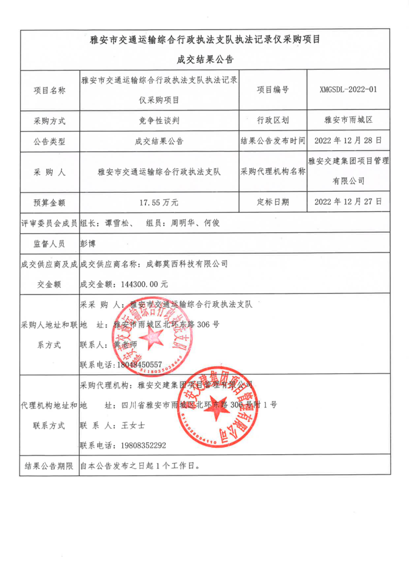 雅安交建集團(tuán)項(xiàng)目管理有限公司雅安市交通運(yùn)輸綜合行政執(zhí)法支隊(duì)執(zhí)法記錄儀采購(gòu)項(xiàng)目成交結(jié)果公告