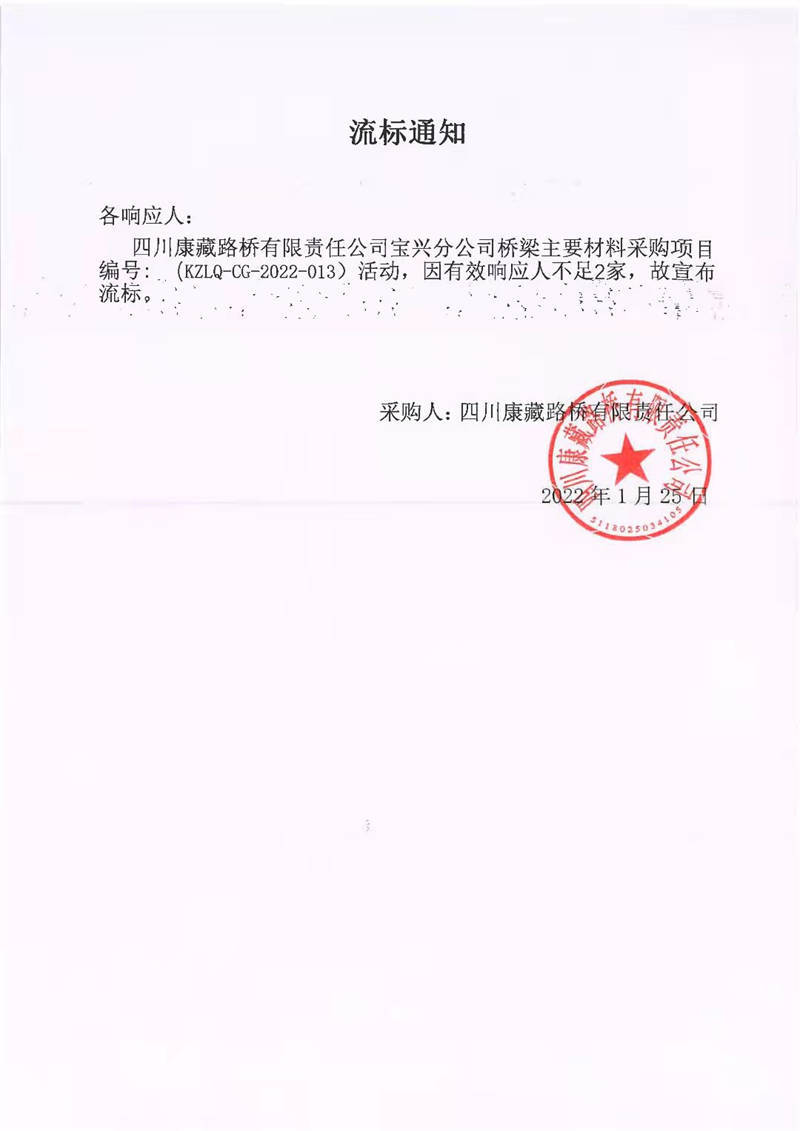 四川康藏路橋有限責(zé)任公司寶興分公司橋梁主要材料采購項目流標(biāo)通知