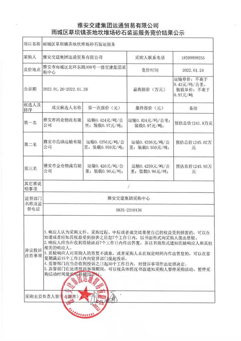 雅安交建集團(tuán)運(yùn)通貿(mào)易有限公司雨城區(qū)草壩鎮(zhèn)茶地坎堆場砂石裝運(yùn)服務(wù)競價(jià)結(jié)果公示