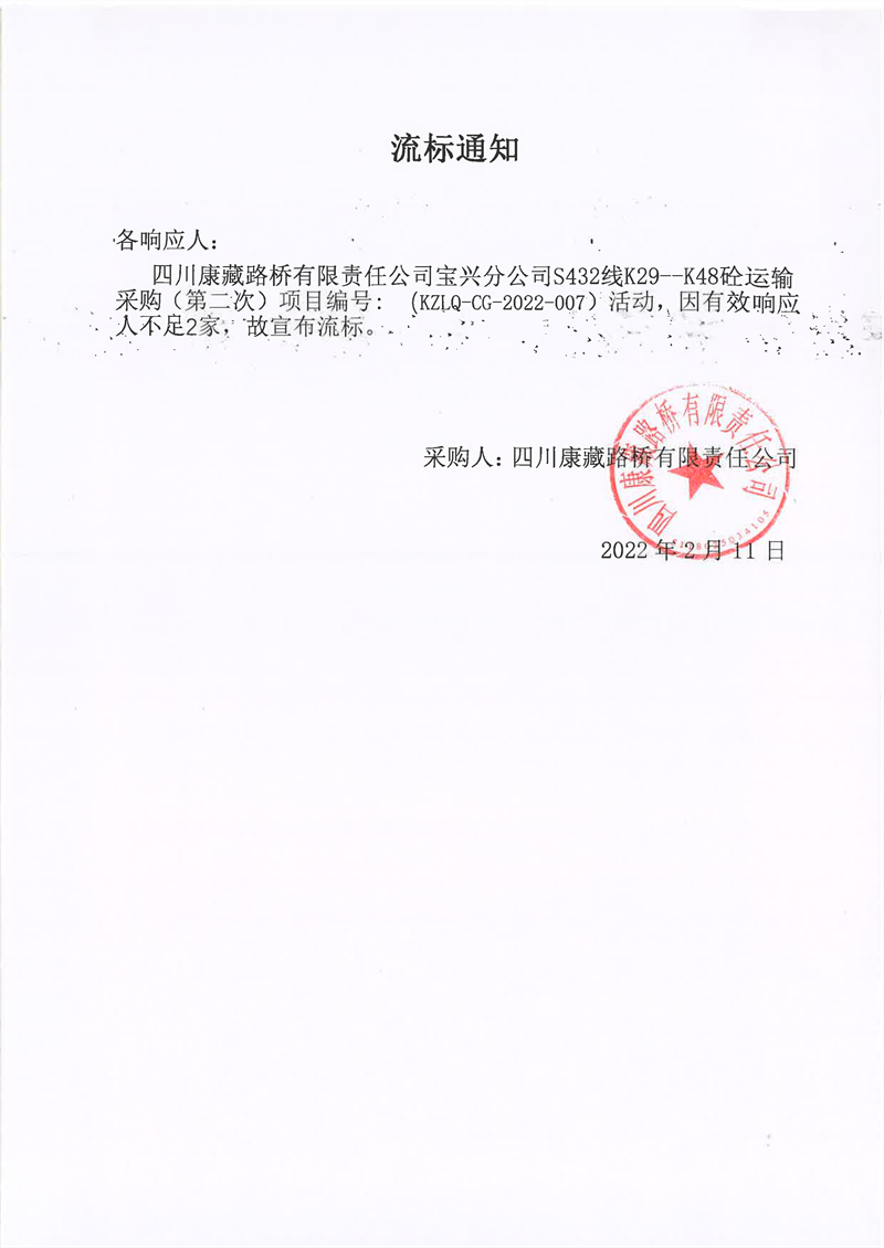 四川康藏路橋有限責(zé)任公司寶興分公司S432線K29-K48砼運(yùn)輸采購(gòu)(第二次)項(xiàng)目流標(biāo)通知