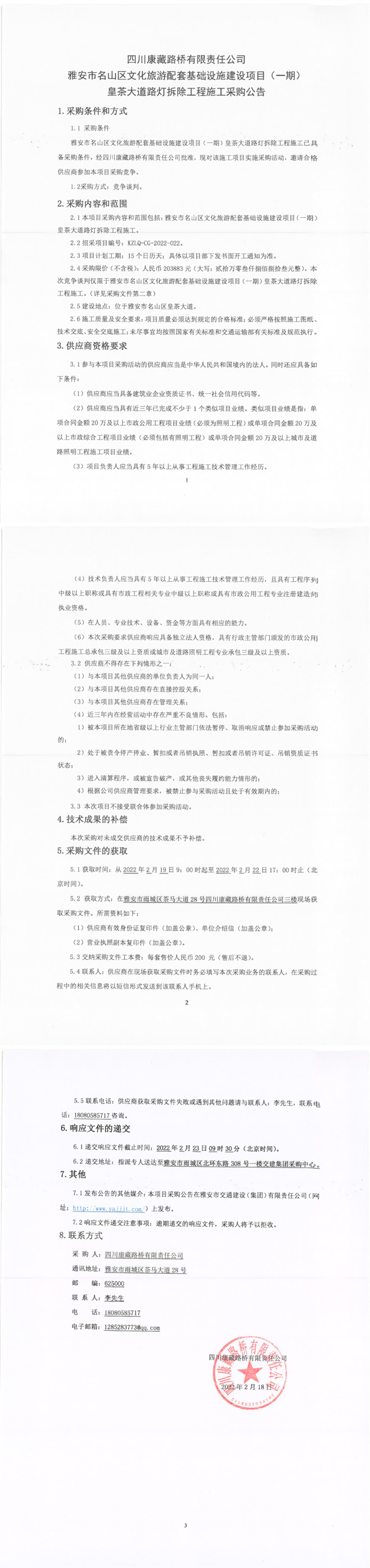 四川康藏路橋有限責(zé)任公司雅安市名山區(qū)文化旅游配套基礎(chǔ)設(shè)施建設(shè)項(xiàng)目(一期)皇茶大道路燈拆除工程施工采購(gòu)公告