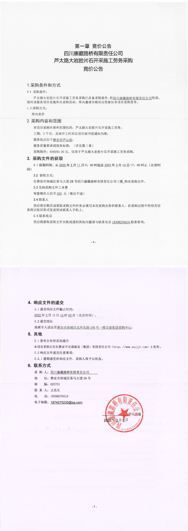 四川康藏路橋有限責(zé)任公司蘆太路大巖腔片石開采施工勞務(wù)采購競價(jià)公告