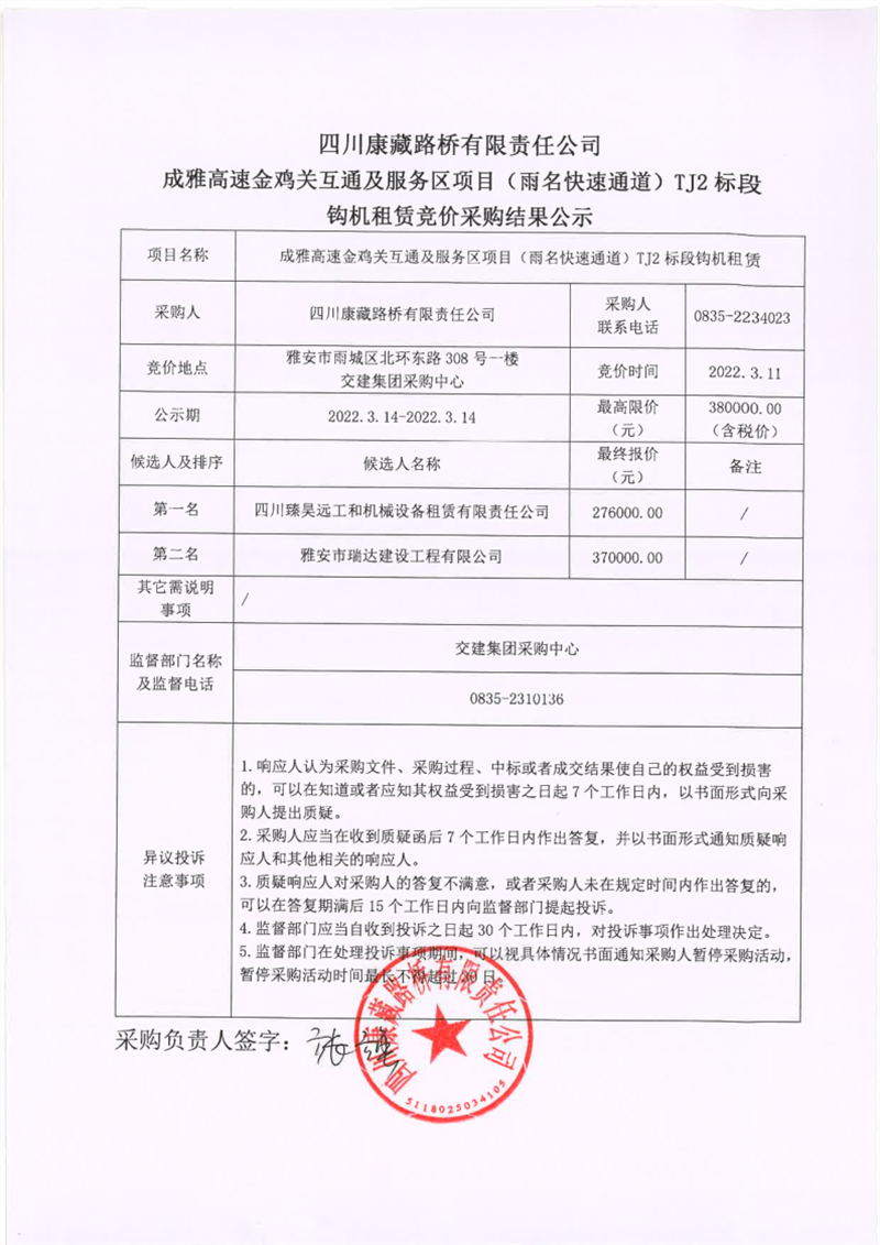 四川康藏路橋有限責任公司成雅高速金雞關互通及服務區(qū)項目(雨名快速通道)TJ2標段鉤機租賃競價采購結果公示