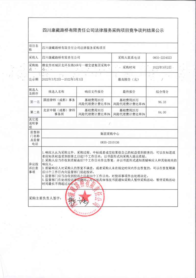四川康藏路橋有限責(zé)任公司法律服務(wù)采購項目競爭談判結(jié)果公示