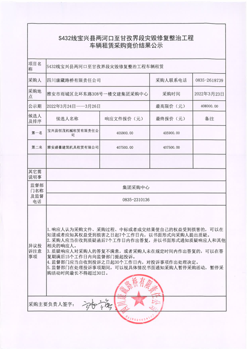 四川康藏路橋有限責(zé)任公司S432線寶興縣兩河口至甘孜界段災(zāi)毀修復(fù)整治工程車輛租賃采購競價(jià)結(jié)果公示