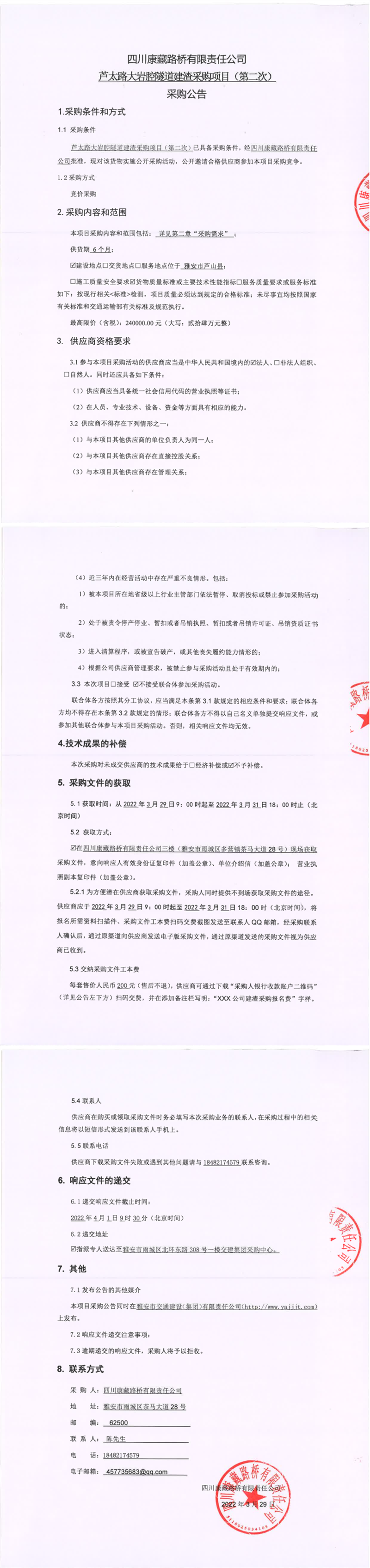 四川康藏路橋有限責(zé)任公司蘆太路大巖腔隧道建渣采購(gòu)項(xiàng)目(第二次)采購(gòu)公告