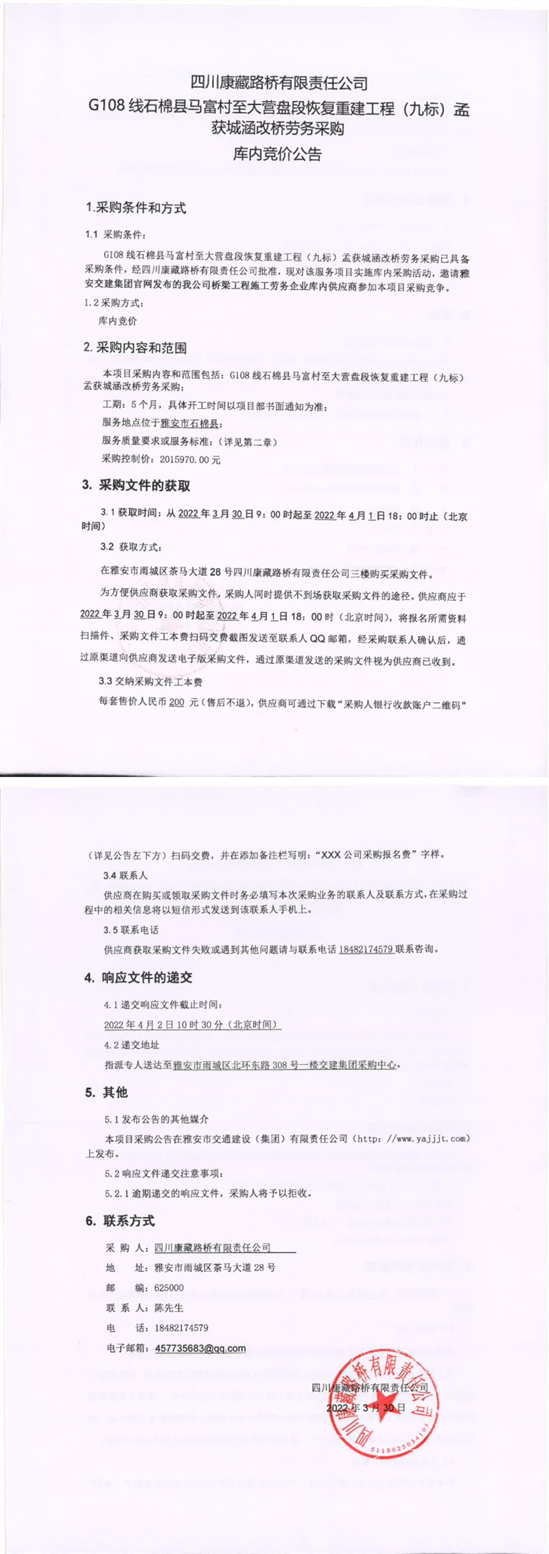 四川康藏路橋有限責任公司G108線石棉縣馬富村至大營盤段恢復重建工程(九標)孟獲城涵改橋勞務(wù)采購庫內(nèi)競價公告