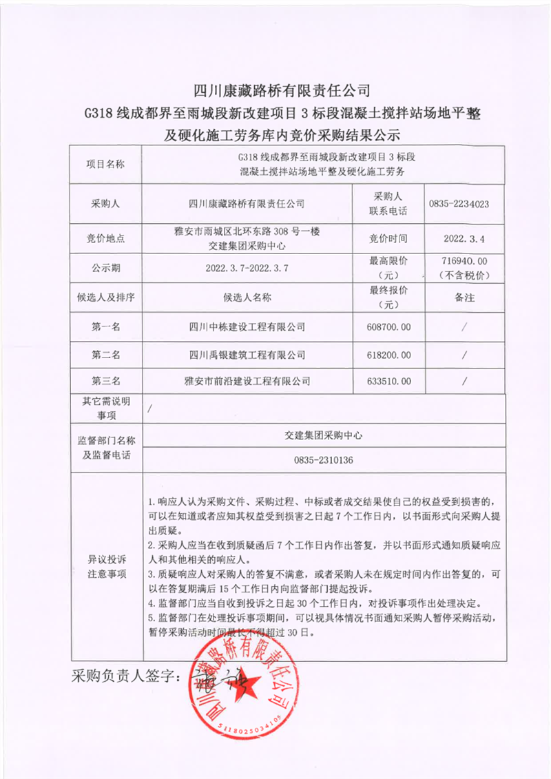 四川康藏路橋有限責(zé)任公司G318線成都界至雨城段新改建項目3標(biāo)段混凝土攪拌站場地平整及硬化施工勞務(wù)庫內(nèi)競價采購結(jié)果公示