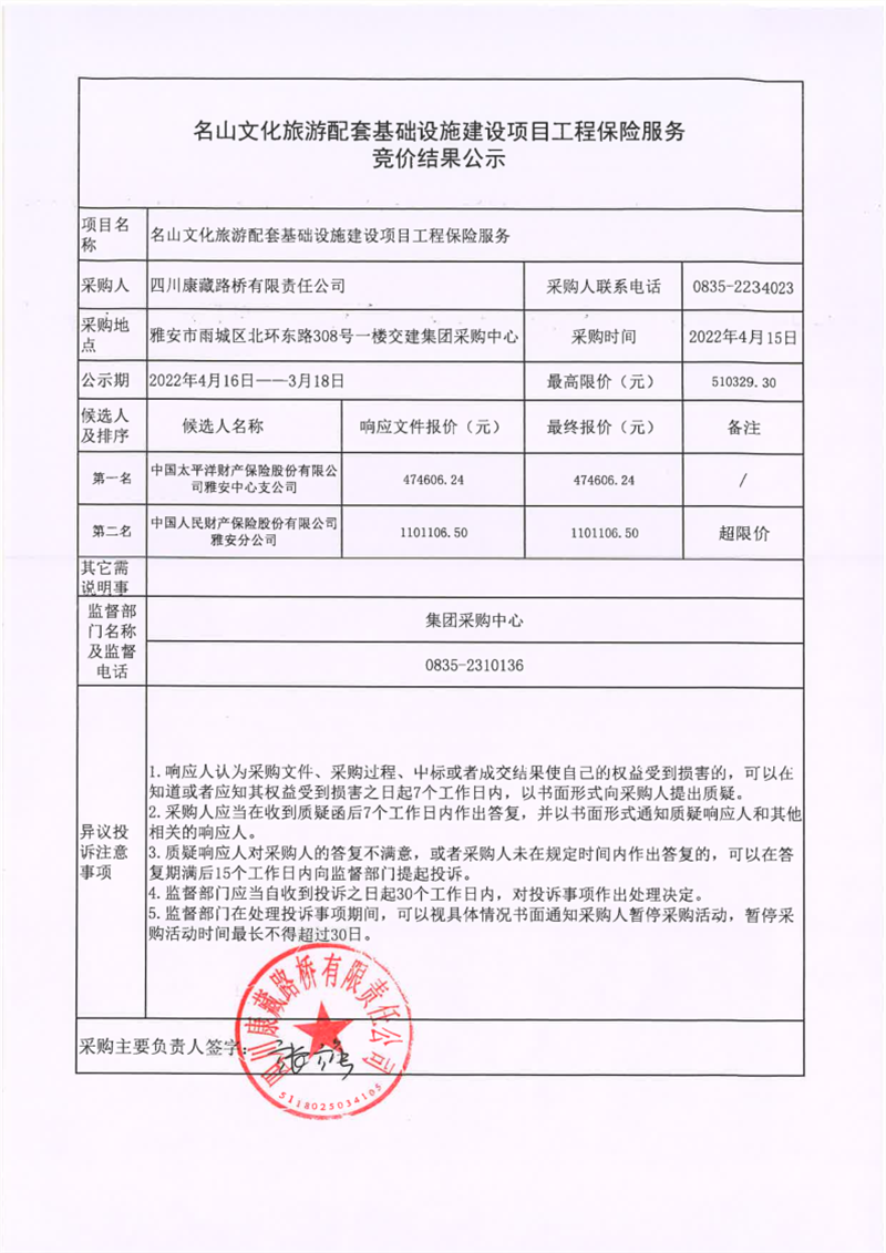 四川康藏路橋有限責(zé)任公司名山文化旅游配套基礎(chǔ)設(shè)施建設(shè)項(xiàng)目工程保險(xiǎn)服務(wù)競(jìng)價(jià)結(jié)果公示
