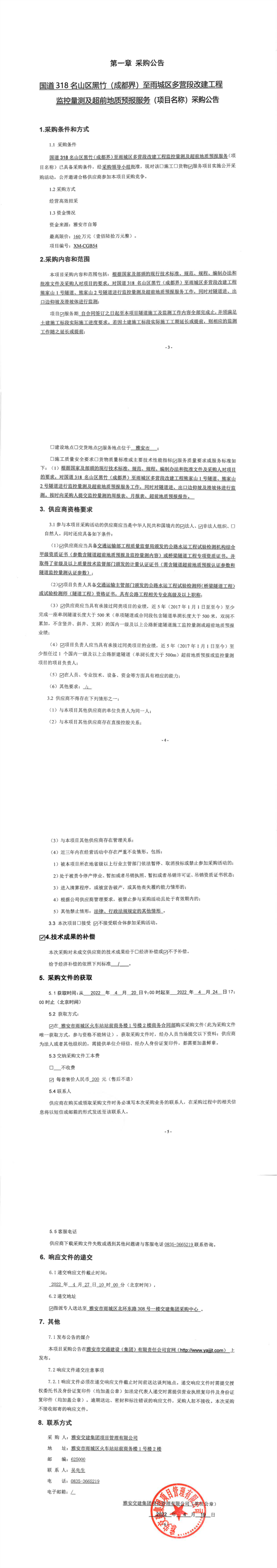 雅安交建集團(tuán)項目管理有限公司國道318名山區(qū)黑竹(成都界)至雨城區(qū)多營段改建工程監(jiān)控量測及超前地質(zhì)預(yù)報服務(wù)采購公告
