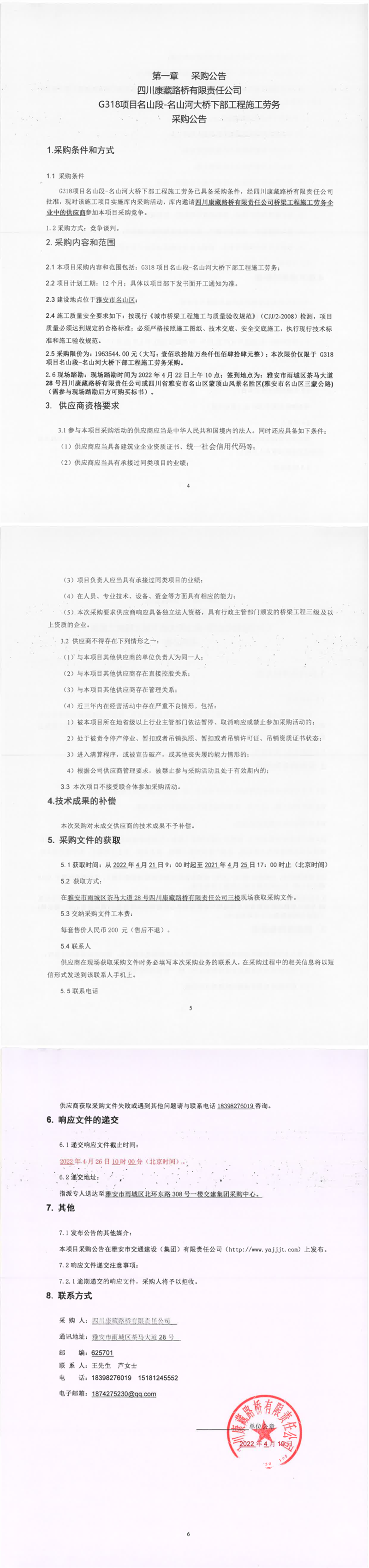 四川康藏路橋有限責(zé)任公司G318項目名山段-名山河大橋下部工程施工勞務(wù)采購公告