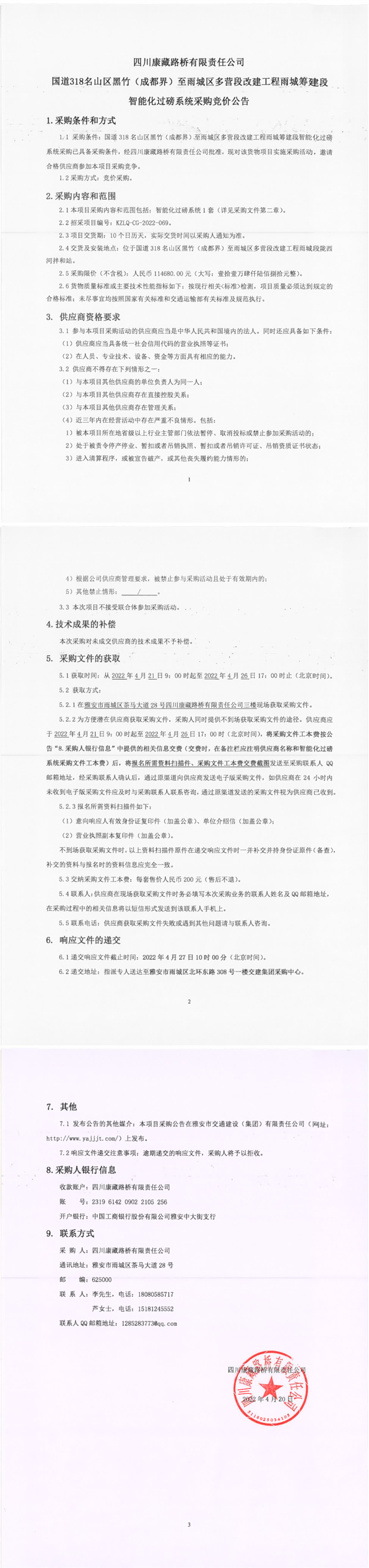 四川康藏路橋有限責(zé)任公司國道318名山區(qū)黑竹(成都界)至雨城區(qū)多營段改建工程雨城籌建段智能化過磅系統(tǒng)采購競價公告