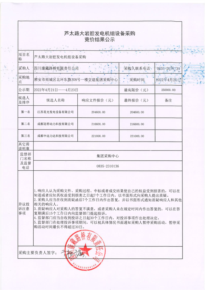 四川康藏路橋有限責(zé)任公司蘆太路大巖腔發(fā)電機組設(shè)備采購競價結(jié)果公示