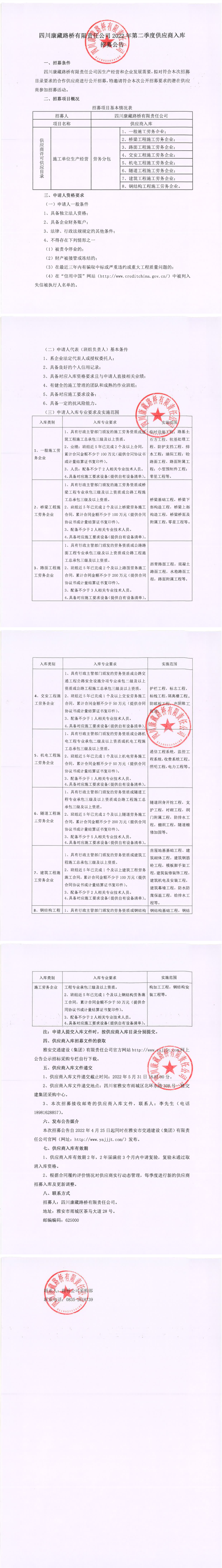 四川康藏路橋有限責(zé)任公司2022年第二季度供應(yīng)商入庫(kù)招募公告