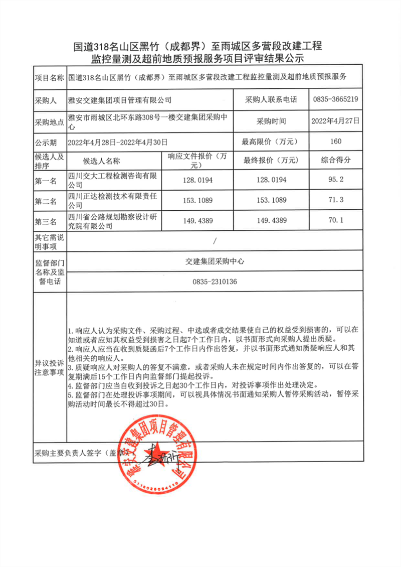 雅安交建集團(tuán)項(xiàng)目管理有限公司國(guó)道318名山區(qū)黑竹(成都界)至雨城區(qū)多營(yíng)段改建工程監(jiān)控量測(cè)及超前地質(zhì)預(yù)報(bào)服務(wù)項(xiàng)目評(píng)審結(jié)果公示