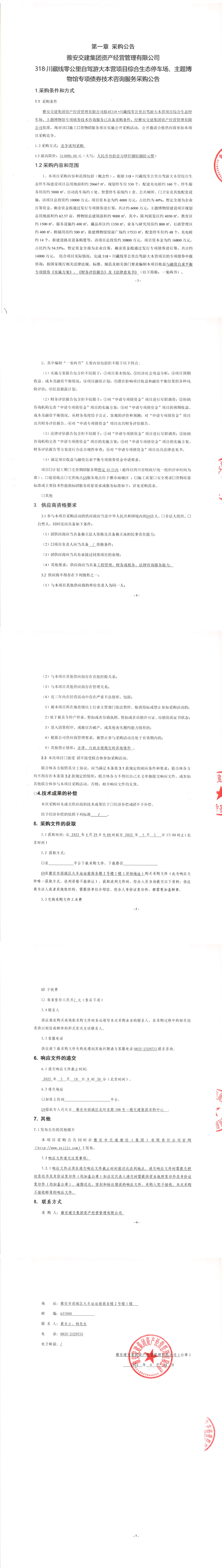 雅安交建集團(tuán)資產(chǎn)經(jīng)營管理有限公司318.川藏線零公里自駕游大本營項目綜合生態(tài)停車場、主題博物館專項債券技術(shù)咨詢服務(wù)采購公告