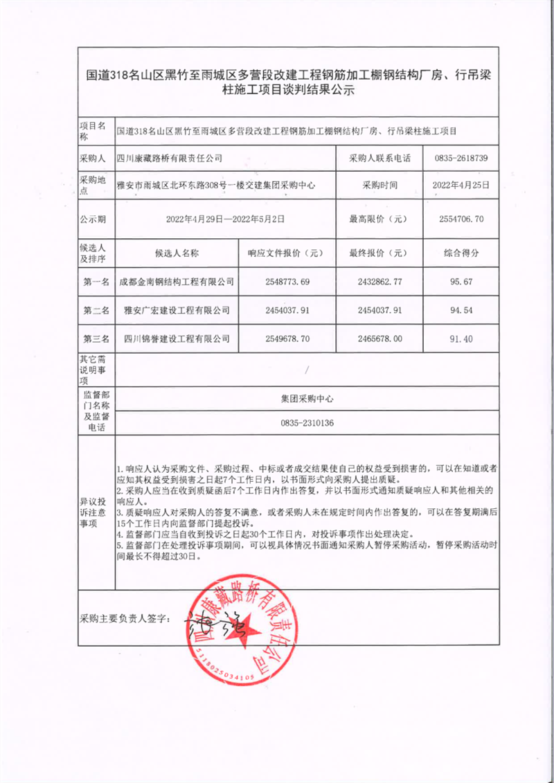 四川康藏路橋有限責任公司國道318名山區(qū)黑竹至雨城區(qū)多營段改建工程鋼筋加工棚鋼結構廠房、行吊梁柱施工項目談判結果公示