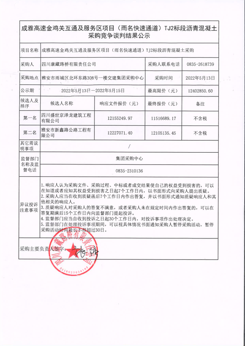 四川康藏路橋有限責任公司成雅高速金雞關互通及服務區(qū)項目(雨名快速通道)TJ2標段瀝青混凝土采購競爭談判結果公示