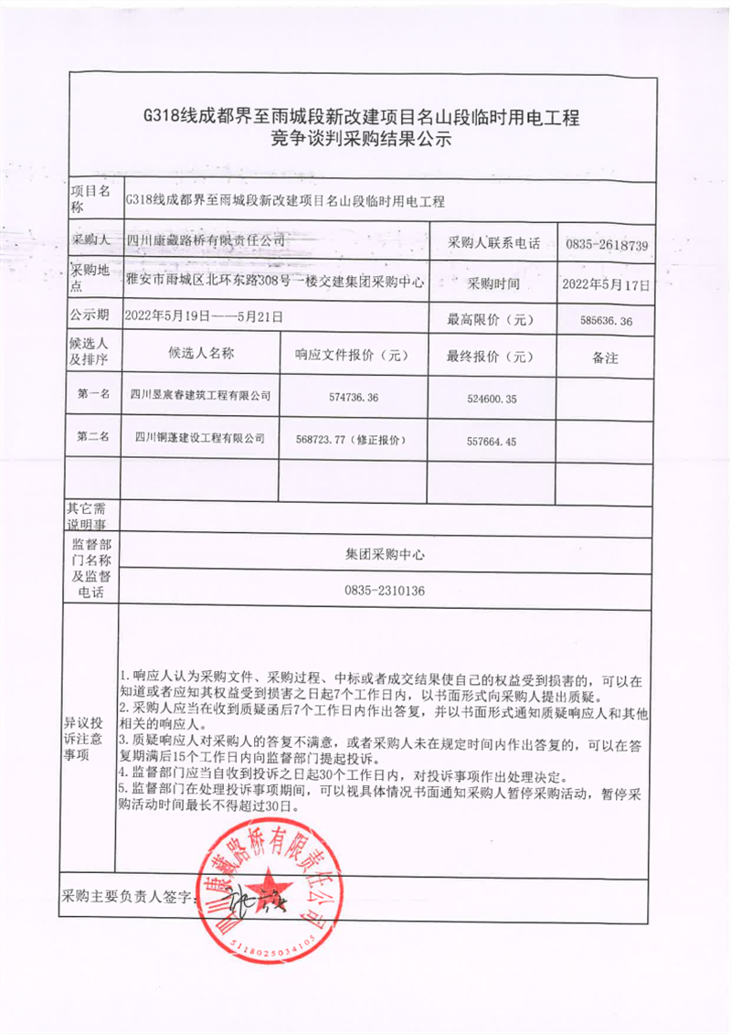 四川康藏路橋有限責(zé)任公司G318線成都界至雨城段新改建項(xiàng)目名山段臨時(shí)用電工程競(jìng)爭(zhēng)談判采購(gòu)結(jié)果公示